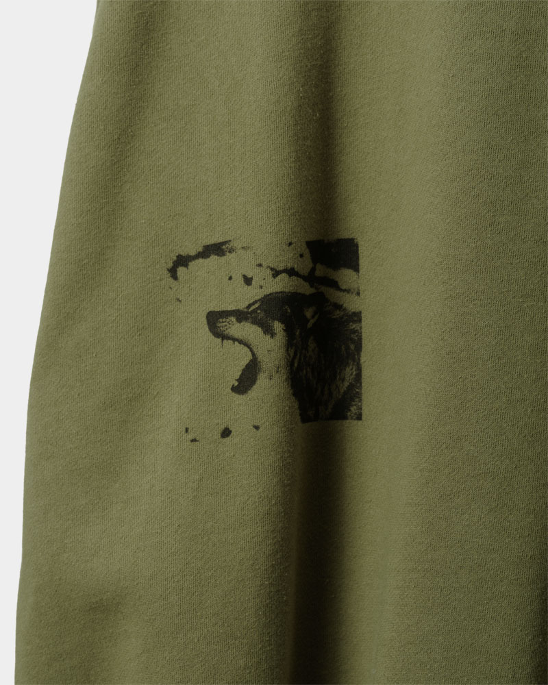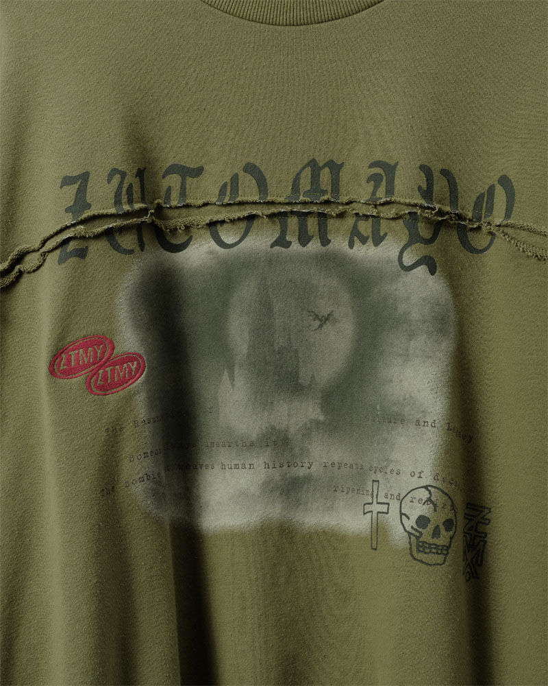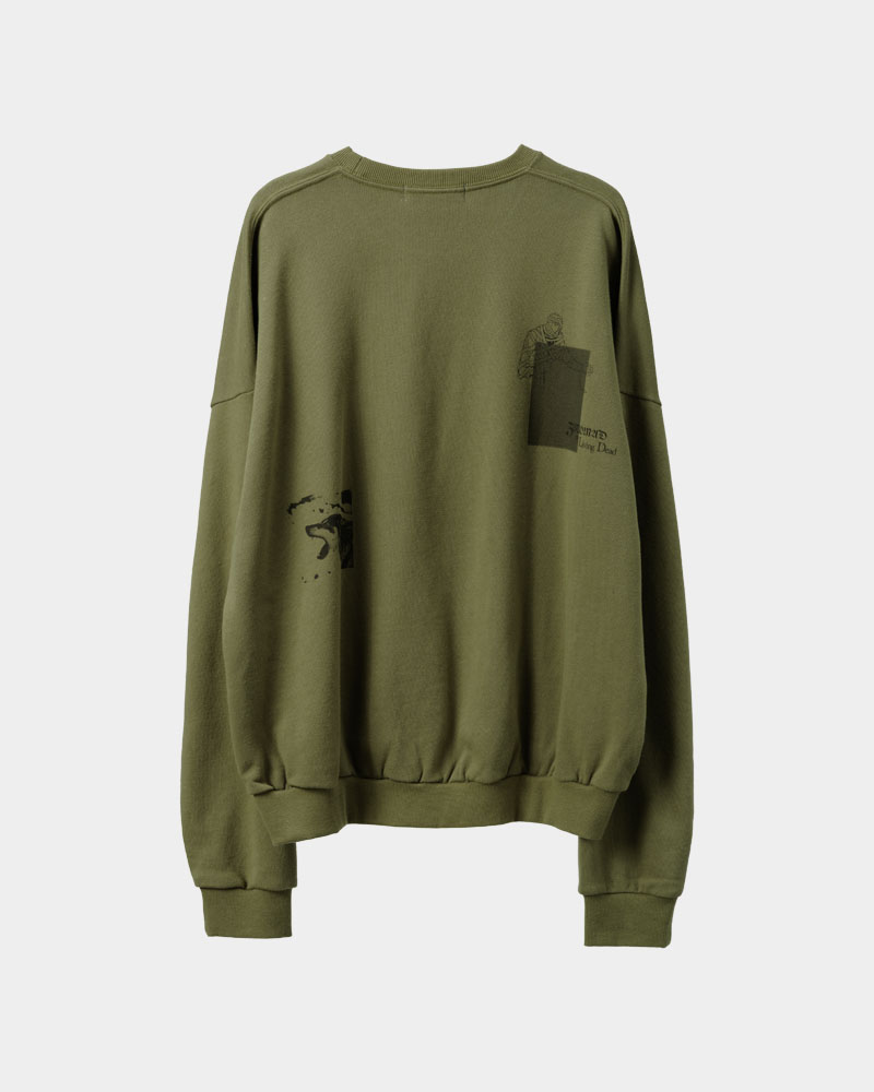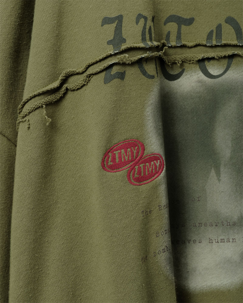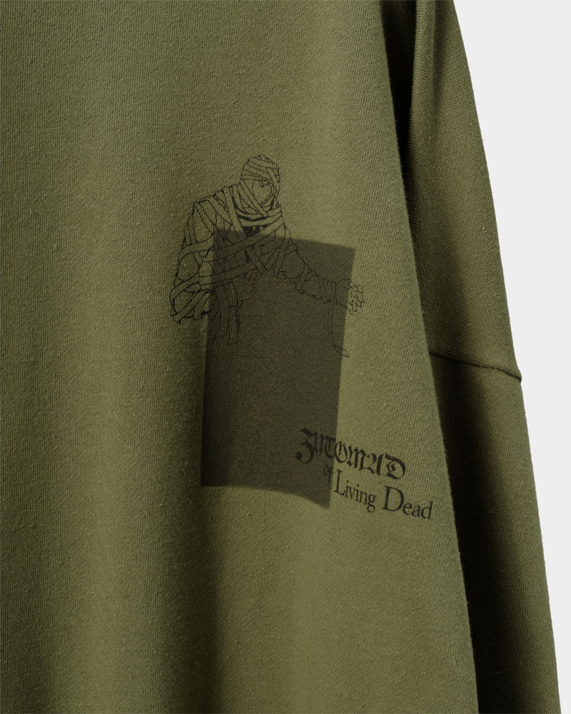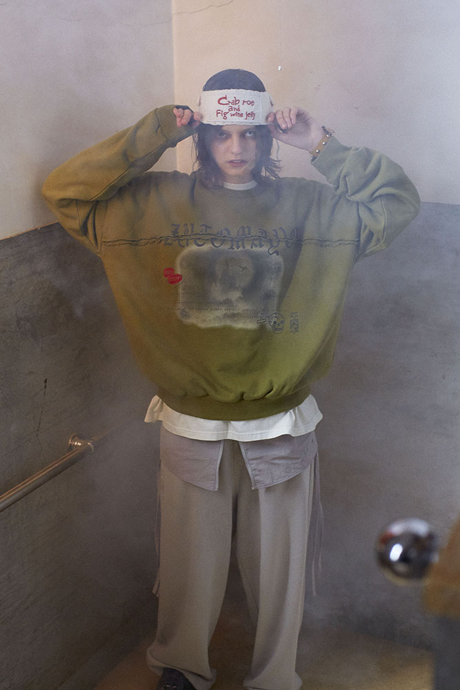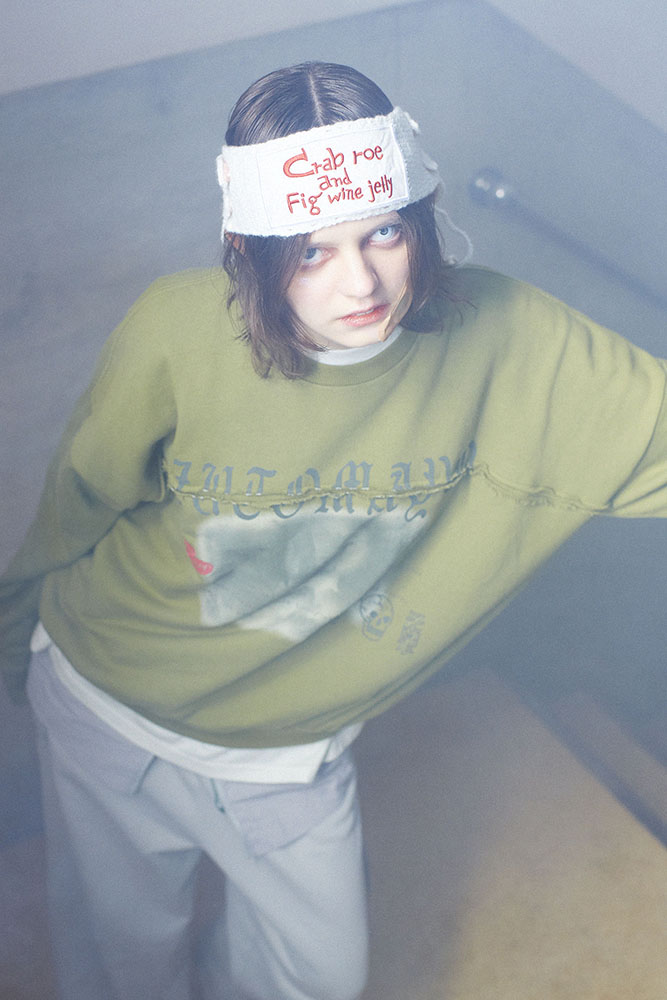 胸元の切り返しが特徴的でスモーキーなスウェット