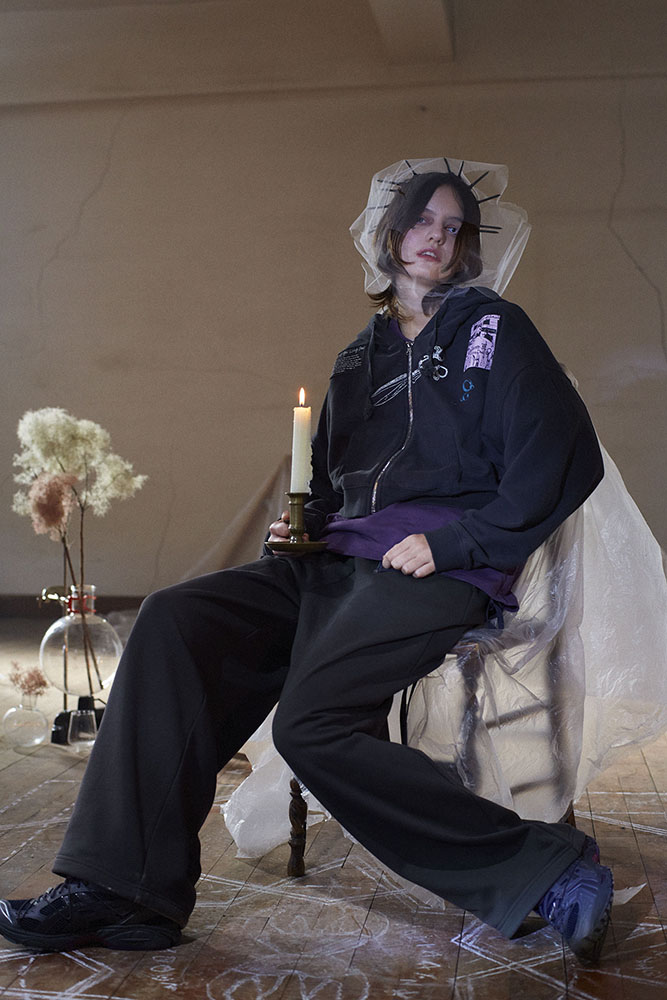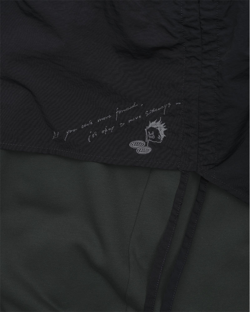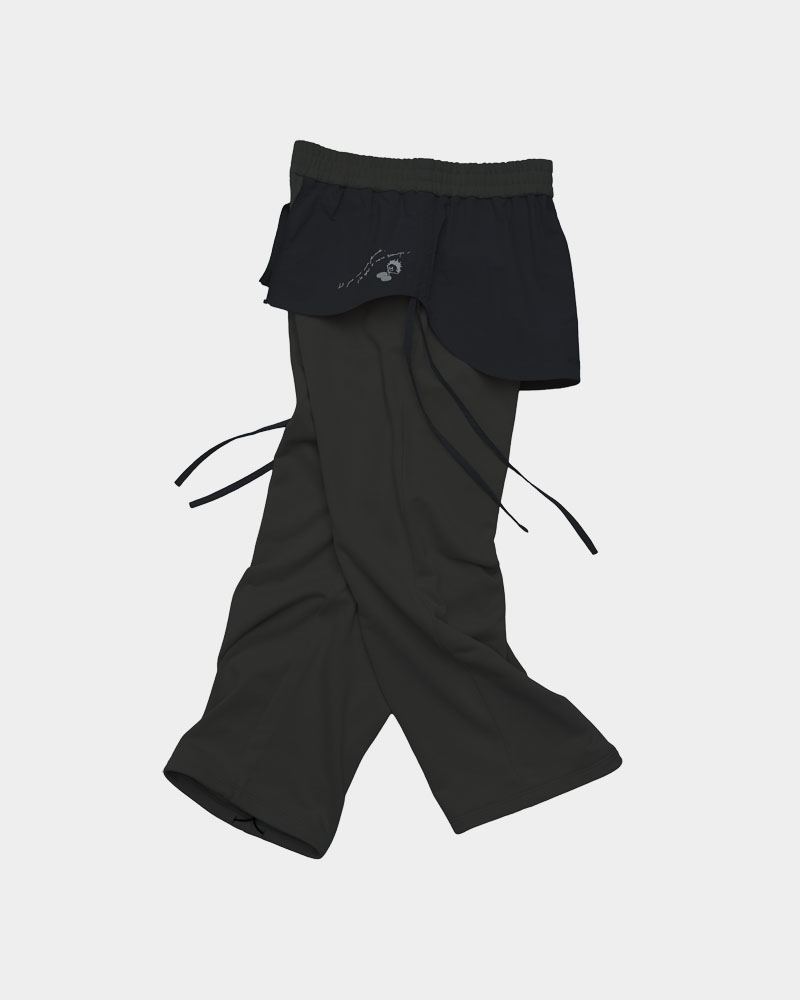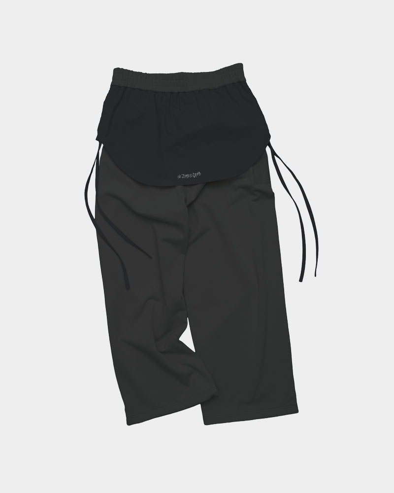 レイヤードでシャツの裾が見えてるかのようなシルエットのドッキングスウェットパンツ。同色で細かなグラフィックや大きく伸びた装飾紐、裾にはドローコード付き。ウエストはゴム仕様、サイズ調整可