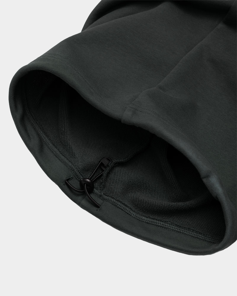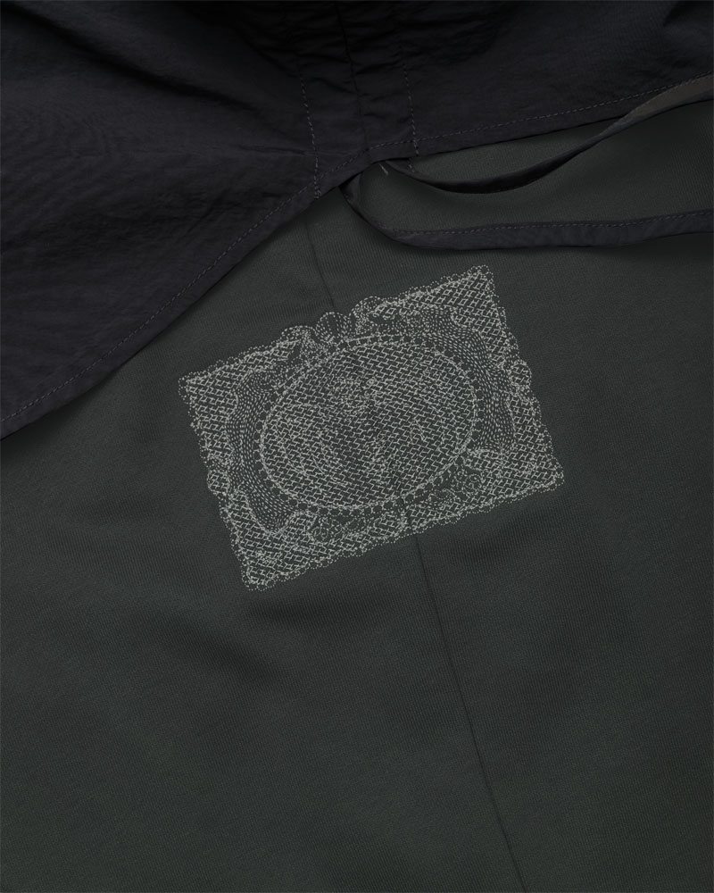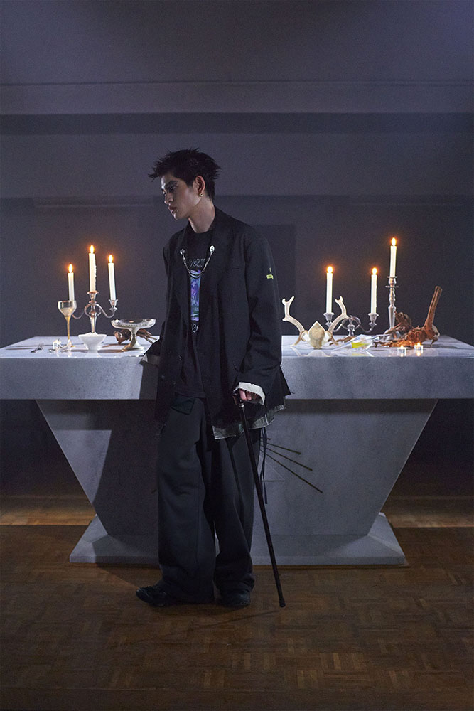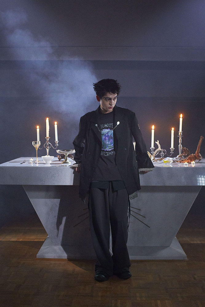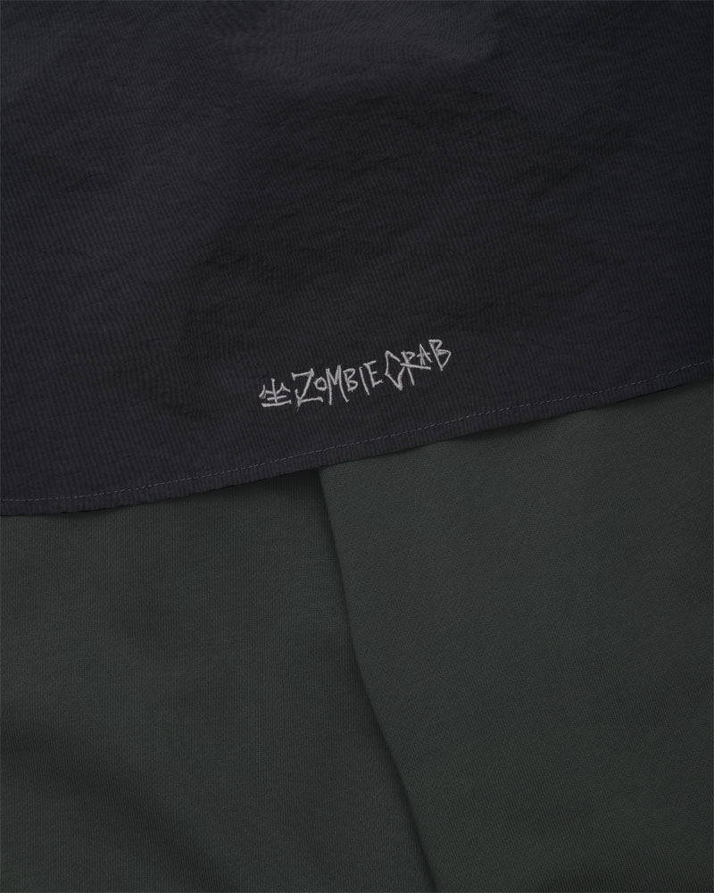 レイヤードでシャツの裾が見えてるかのようなシルエットのドッキングスウェットパンツ。同色で細かなグラフィックや大きく伸びた装飾紐、裾にはドローコード付き。ウエストはゴム仕様、サイズ調整可